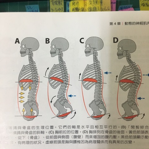 由上圖我們可以看到,上面的紅色部分是橫膈膜,下面的紅色部分是骨盆底, ABCD是各個姿勢下橫膈與骨盆的相對位置: