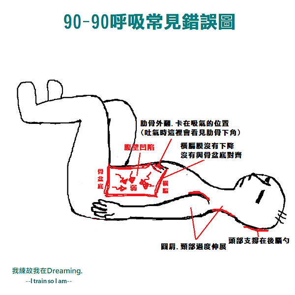 在仰臥的姿勢下呼吸幾次之後,吐氣吐到完全沒氣,讓肋骨往骨盆的方向下降、放鬆,這一個步驟很重要!!很多人在練習仰臥呼吸的時候,吐氣時吐的不夠,同時肋骨外翻,卡在吸氣的位置沒有下降,這會造成頸部跟上胸肢段緊繃無法放鬆,頸椎不在中立位置上。步驟一有講到當脊椎回到中立位的時候,橫膈與骨盆必須相對。橫膈膜附著在肋骨上,因此當肋骨卡在吸氣位置、外翻時,橫膈膜與骨盆就不會在相對的位置上。 (參考上面90-90呼吸錯誤圖)